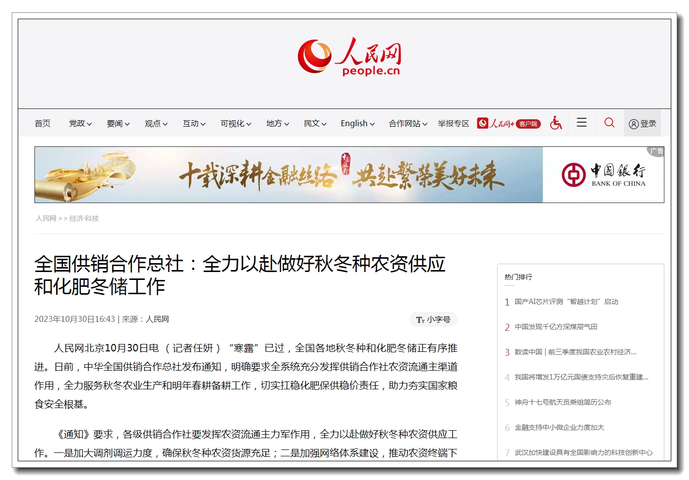 “寒露”已過,全國各地秋冬種和化肥冬儲正有序推進(jìn)。日前,中華全國供銷合作總社發(fā)布通知,明確要求全系統(tǒng)充分發(fā)揮供銷合作社農(nóng)資流通主渠道作用,全力服務(wù)秋冬農(nóng)業(yè)生產(chǎn)和明年春耕備耕工作,切實扛穩(wěn)化肥保供穩(wěn)價責(zé)任,助力夯實國家糧食安全根基。