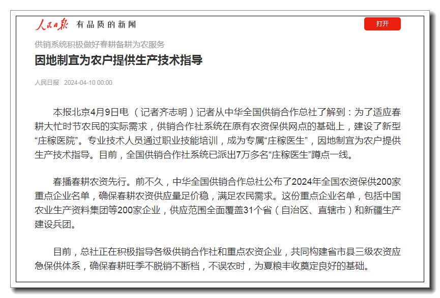 春播春耕農(nóng)資先行。前不久,中華全國供銷合作總社公布了2024年全國農(nóng)資保供200家重點企業(yè)名單,確保春耕農(nóng)資供應(yīng)量足價穩(wěn),滿足農(nóng)民需求。這份重點企業(yè)名單,包括中國農(nóng)業(yè)生產(chǎn)資料集團(tuán)等200家企業(yè),供應(yīng)范圍全面覆蓋31個省(自治區(qū)、直轄市)和新疆生產(chǎn)建設(shè)兵團(tuán)。