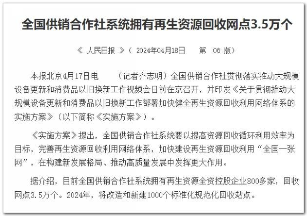 全國供銷合作社貫徹落實推動大規(guī)模設備更新和消費品以舊換新工作視頻會日前在京召開,并印發(fā)《關于貫徹推動大規(guī)模設備更新和消費品以舊換新工作部署加快健全再生資源回收利用網(wǎng)絡體系的實施方案》(以下簡稱《實施方案》)。